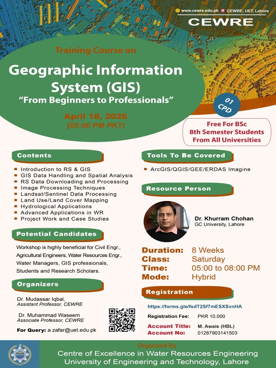 Start Date: April 18, 2026 05:00 PM PST Duration: 8 Weeks Mode: Hybrid The Centre of Excellence in Water Resources Engineering (CEWRE), UET Lahore, is organizing a training course in hybrid mode (Online/Physical) at CEWRE, UET Lahore. Join us for …